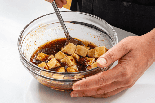 Add the tofu to the mixture, cover it, and let it marinate for at least 1 hour (preferably 3 hours).