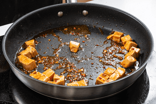 Pour vegetable oil into a large non-stick pan and heat it over medium-high heat. Remove the tofu from the marinade and fry it on all sides in the pan.