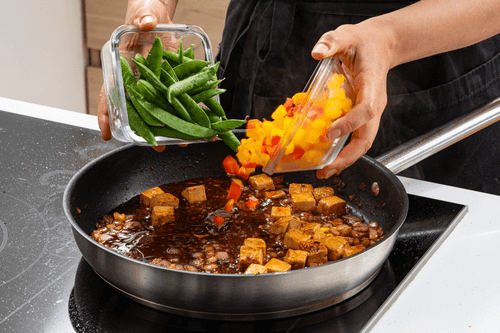 Pour the remaining tofu marinade into the pan, bring to a boil, and add the sweet pepper and snap peas. Cook for another 4-5 minutes. If the sauce seems too thick, add a little water.