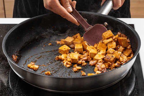 Once the tofu is fried, add the onion to the pan and cook for another 2-3 minutes, stirring until the onion turns golden.
