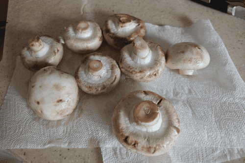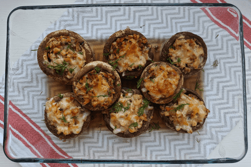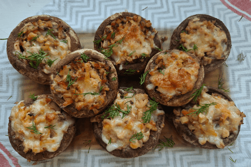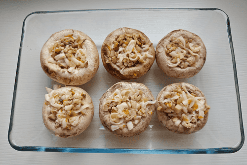 Stuff the mushrooms with the prepared mixture and place them in a preheated oven at 200 degrees for 20 minutes.