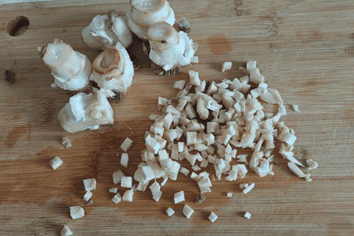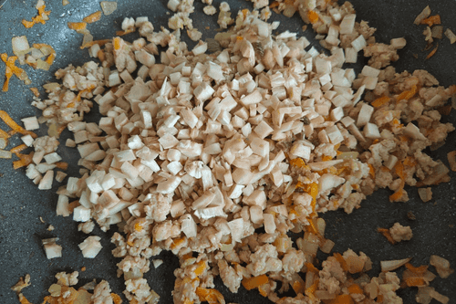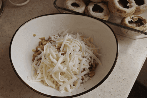Add finely chopped mushrooms to the prepared minced meat. Sauté for 3-4 minutes until cooked and transfer to a separate bowl.