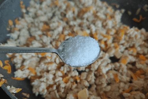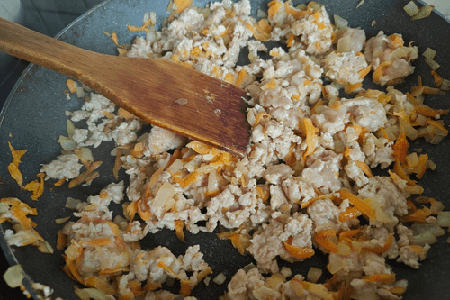 Add the chicken mince and constantly stir with a wooden spatula, breaking up lumps until smooth.