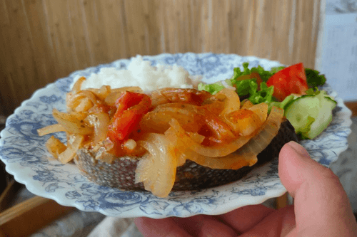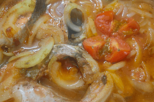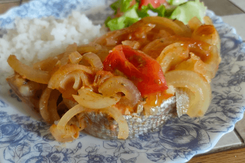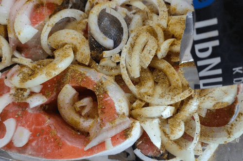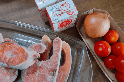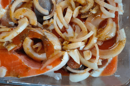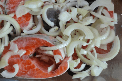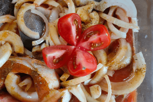 Trout with onions in tomato sauce is a refined dish of Russian cuisine that combines the tenderness of fish with the aroma of onions and the rich flavor of tomato sauce. The trout, which does not require thawing, is baked with onions and spices, while the tomato juice adds a slight acidity and juiciness. Sweet cherry tomatoes complement the composition, creating a balance of flavors. This dish is perfect for family dinners or festive gatherings due to its rich taste and pleasant aroma. Its simplicity makes it accessible even for novice cooks, while the combination of ingredients ensures nutrition and health benefits. It is served hot with a garnish of fresh vegetables or herbs, highlighting the natural harmony of flavors.