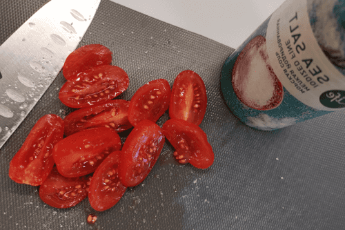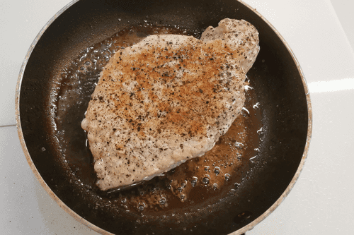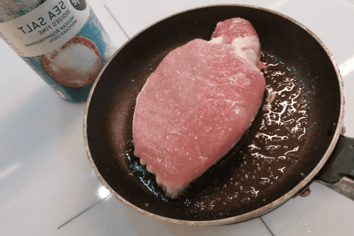 Place the pork neck in heated oil in the frying pan. Fry for 3-4 minutes on high heat. Add salt.