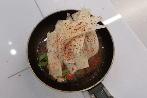 Place cheese on top and season with chili flakes. Cover with a lid and simmer for 3-5 minutes until the cheese melts.