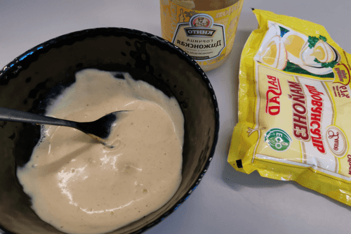 For the sauce, mix mayonnaise and mustard in a bowl.