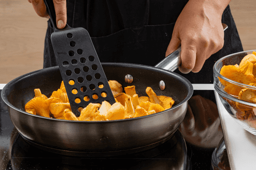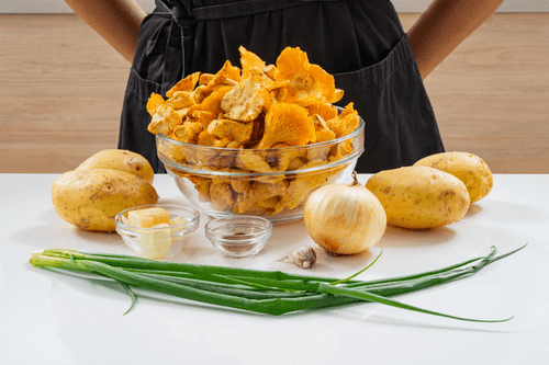 Clean chanterelles with a damp cloth or brush, only wash them if they are dirty. Cut large chanterelles so that all mushrooms are roughly the same size.