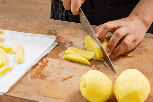 Peel the potatoes and cut them into sticks. Dry them on paper towels.