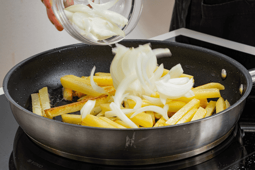 Add the onion and fry, stirring, for another 10 minutes; the potatoes should be soft and the onion golden.