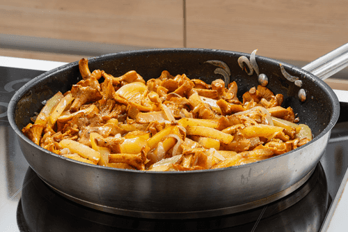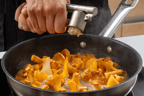 Add a pressed clove of garlic to the chanterelles and fry for another 5 minutes.