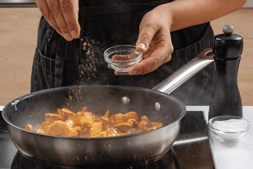 Add coriander to the chanterelles, salt, pepper, and mix.
