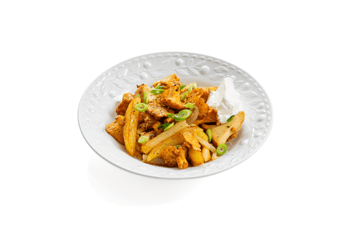 Fried chanterelles with potatoes are a true embodiment of Russian cuisine, where simplicity meets rich flavor. Chanterelles, these forest delicacies, add a delicate nutty note to the dish, while golden potatoes provide heartiness. Sautéed in a mix of butter and vegetable oil, the mushrooms release their aroma, complemented by garlic and coriander for a piquant touch. This dish is perfect for a cozy home dinner or a festive table. Traditionally served with a dollop of sour cream and fresh green onions, it creates a harmony of flavors and textures. Chanterelles are known for their subtle mushroom aroma that pairs with the softness of potatoes, making this dish truly comforting and unforgettable.