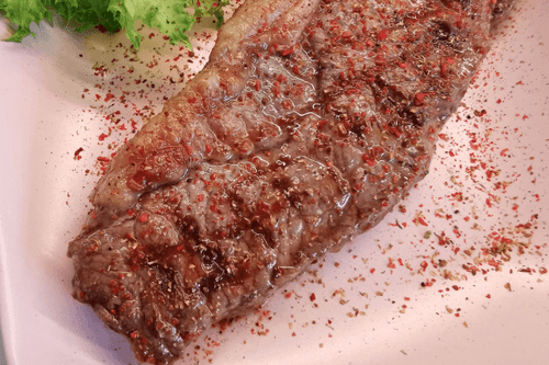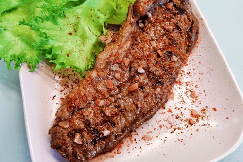 Стейк стриплойн со специями — это воплощение американской кухни, где сочность мяса встречается с пикантностью специй. Стриплойн — один из самых популярных отрубов, известный своей насыщенной мраморностью и глубоким мясным вкусом. Обжарка на гриле в сочетании с горчичным и оливковым маслом придает ему золотистую корочку и неповторимый аромат. Перец чили и сухая аджика добавляют приятную остроту, а розовая гималайская соль подчеркивает естественную насыщенность говядины. Подача на свежих салатных листьях делает блюдо легким и эстетически привлекательным. Этот стейк — идеальный выбор для ценителей насыщенного вкуса, идеально сочетающийся с бокалом красного вина или освежающим гарниром.