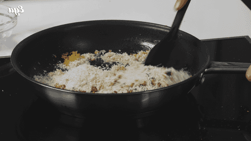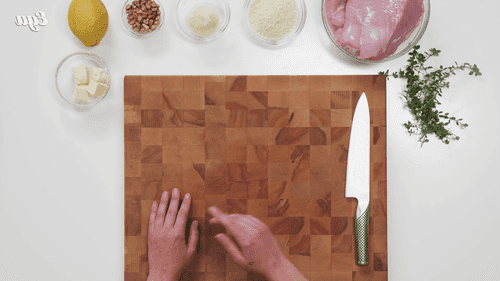 Add breadcrumbs, pistachios, lemon zest, 2 tablespoons of lemon juice, and half of the chopped thyme to the onion. Fry until the breadcrumbs turn golden.