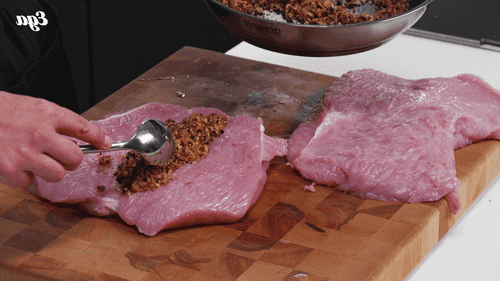 Dry the turkey and place it skin side down on a board. Put the stuffing inside, roll the turkey into a roulade, and tie it with kitchen twine.