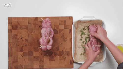 Line the baking dish with parchment paper. Place the remaining thyme sprigs at the bottom.