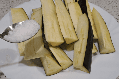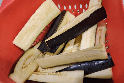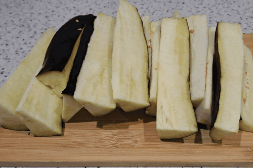 Wash the eggplants well under running water, trim both ends, cut in half, and then cut each half into about 6-8 sticks.