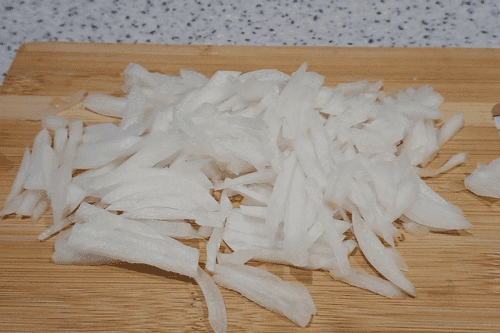 Clean the sweet red pepper, wash it well, and cut it into strips.