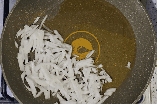 Pour 35 ml of sunflower oil into a separate pan and add the sliced onion.