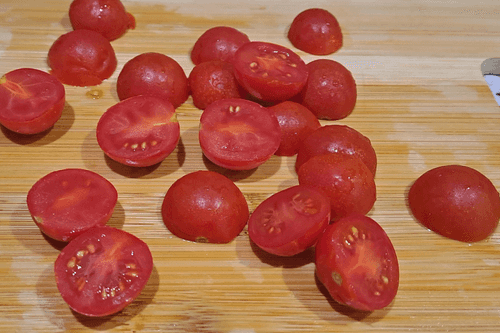 Wash the cherry tomatoes well, dry them a bit, and cut them in half.