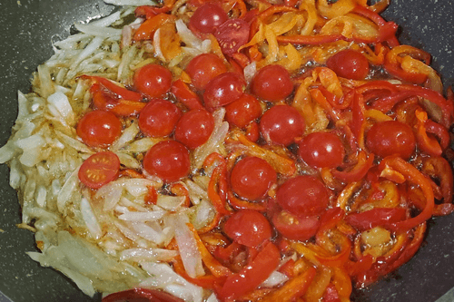 Place the chopped tomatoes in the pan with the onion and pepper. Fry everything until golden brown.