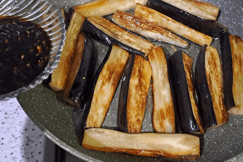 Pour soy sauce with garlic into the pan with fried eggplants. Fry over medium heat for about 7-10 minutes, stirring occasionally.