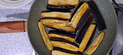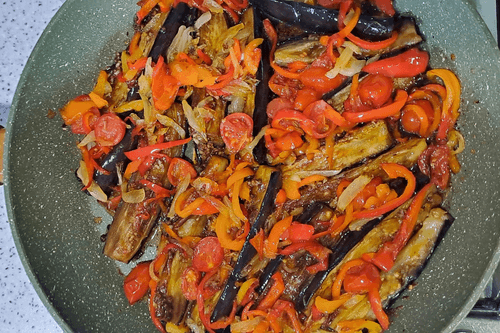 Place the cooked vegetables in the pan with the eggplants. Add salt to taste if desired.