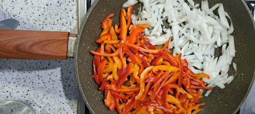 Add the chopped pepper to the pan. Place the pan with onion and pepper on low heat.