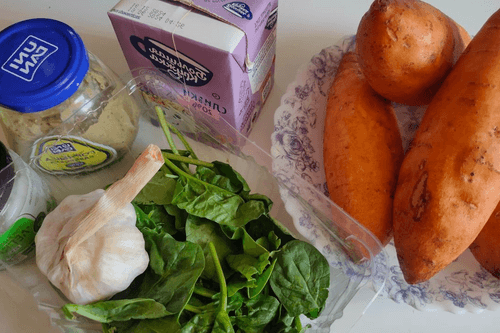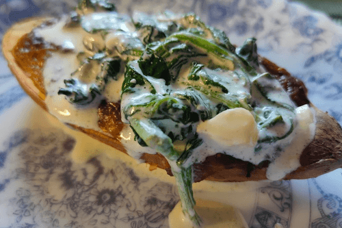 Baked sweet potato with spinach and cream sauce
