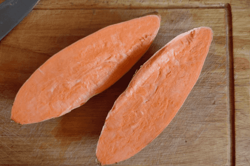 Wash the sweet potato and cut it in half.
