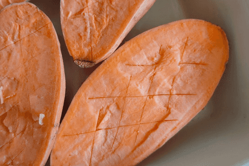 Make cross-shaped cuts on the sweet potato.
