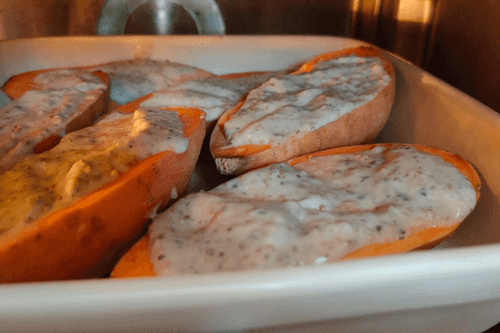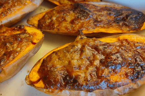Spread the mixture on the halves of the sweet potato.