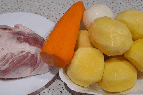 Peel the onion and carrot, wash them well, cut into large sticks or cubes, and add to the pan with the slightly browned meat.