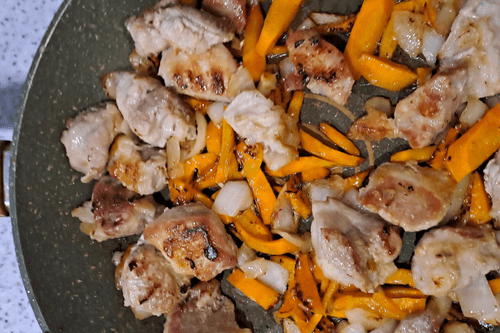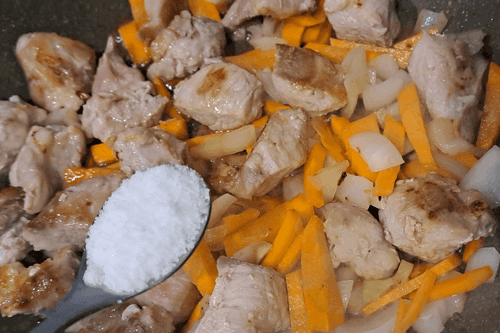 Fry the meat in a pan without a lid with onions and carrots until golden brown.