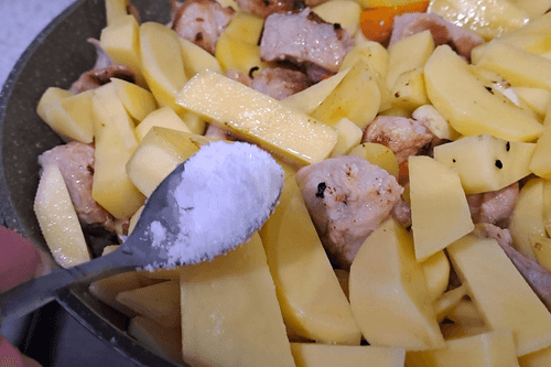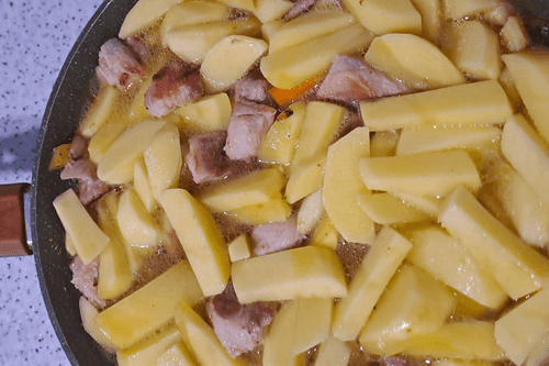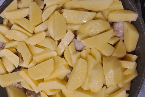 Peel the potatoes, wash them well under running water, dry them a bit, cut into large sticks or cubes, and place them in the pan on the meat.