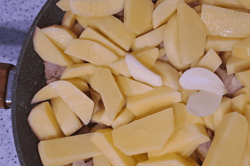 Peel the garlic, wash it well under running water, slice it, and add it to the pan with the potatoes.