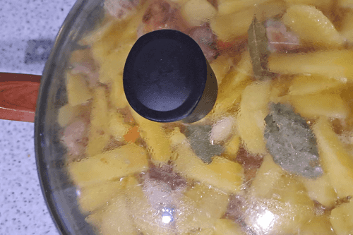 Add 3 bay leaves to the potatoes and meat, cover the pan, and simmer on low heat for about 40-50 minutes, stirring occasionally.