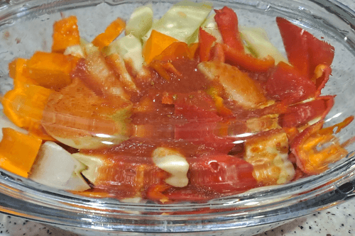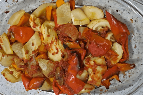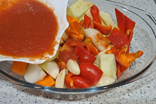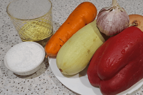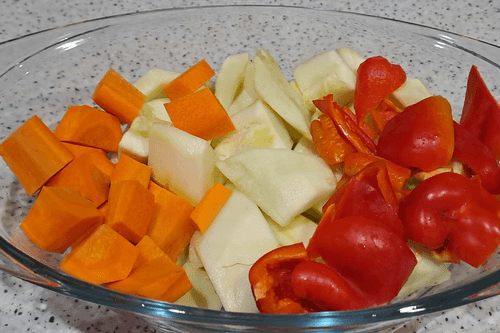 Clean the sweet pepper from seeds, wash well under running water, cut into large cubes, and place in a baking dish with zucchini and carrots.