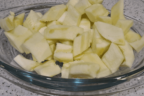 Wash the young zucchini well, peel if necessary, and cut into large cubes. Place in a baking dish.