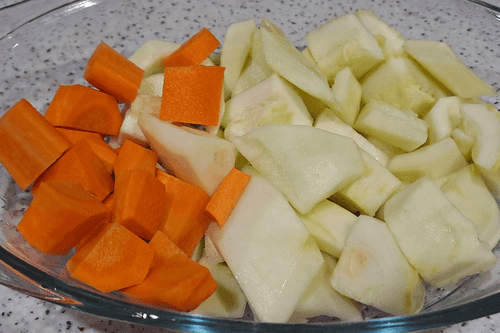 Peel the carrot, wash it well under running water, cut it into large cubes, and add it to the container with the zucchini.