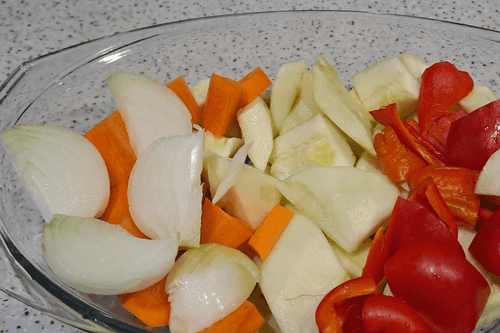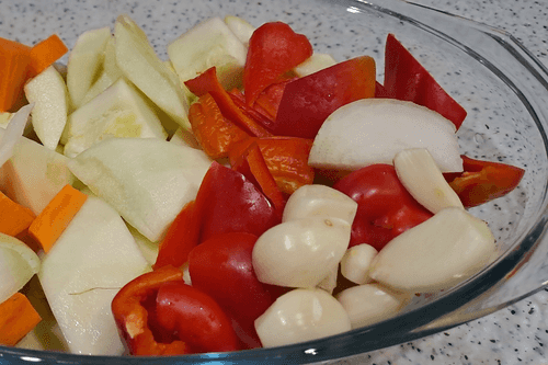 Cover the baking dish with chopped vegetables with a lid or foil.