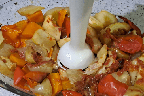 Peel the garlic, wash it well under running water, and place it with the vegetables.