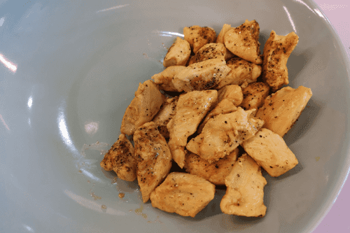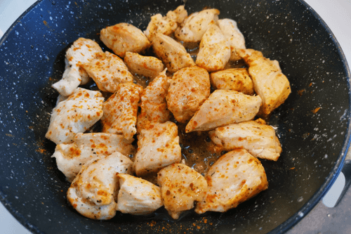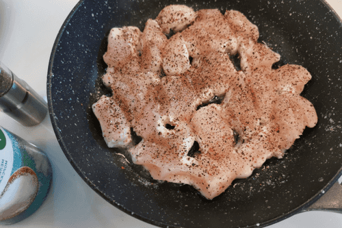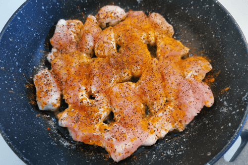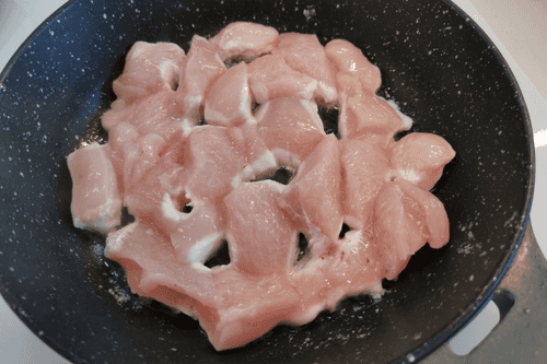 Place sliced chicken in the pan.