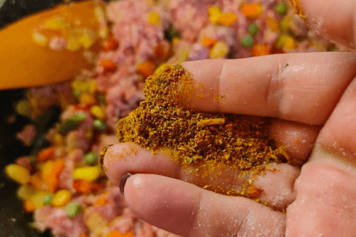 Cook vegetables with minced meat for 10 minutes, adding spices for meat.