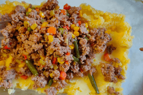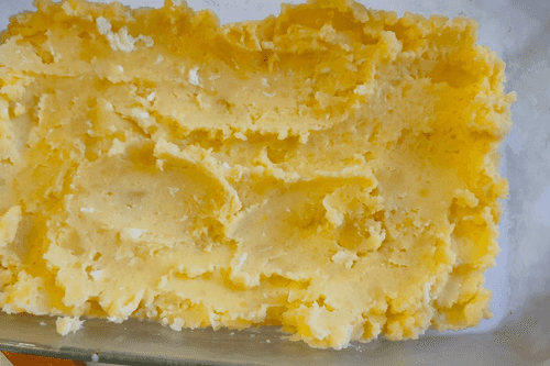 Spread half of the mashed potatoes in a baking dish and evenly distribute it on the bottom - this is the first layer.