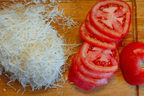 Slice the tomato into thin circles, grate the cheese on a fine grater.