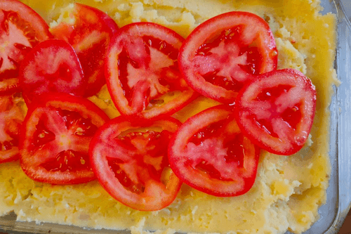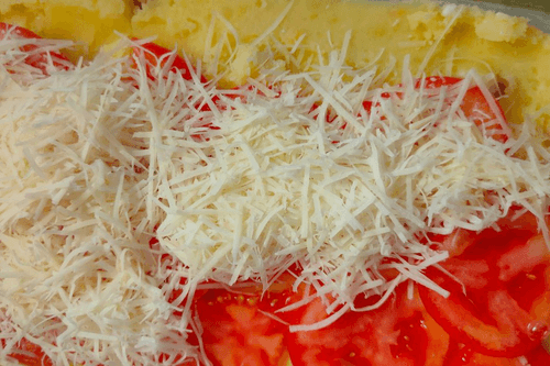 The fourth layer - place the tomatoes on the potato layer.