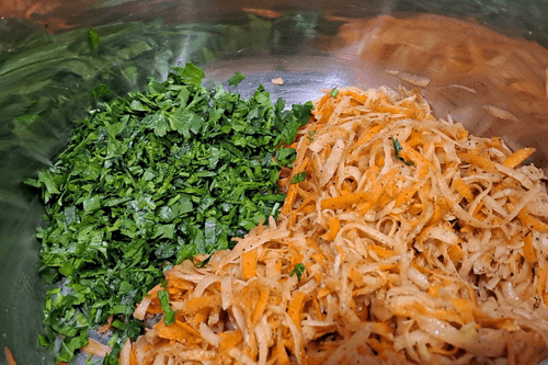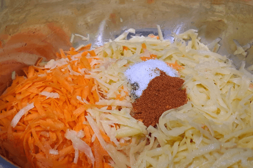 Add 1 teaspoon of salt and 1 teaspoon of ground pepper mix to the grated carrots and potatoes. Mix everything well.