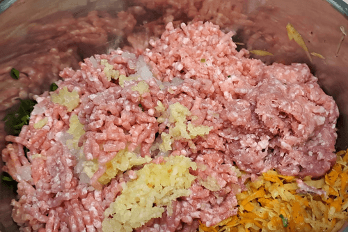 Peel the garlic head, wash it well under running water, press it through a garlic press, and add it to the minced meat.
